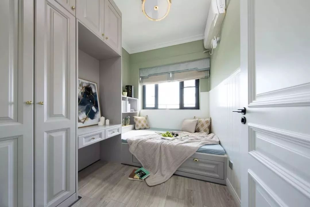 儿童房是做了榻榻米组合衣柜的设计,衣柜中留出一个书桌工作区,方便孩子平时读书做作业。绿色和白色结合的墙面,让儿童房看起来更有层次感。