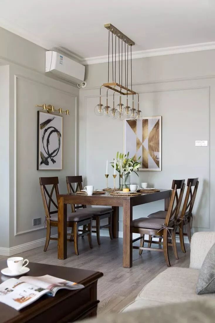 餐厅背景墙的设计和沙发背景墙基本上相同,颜色也刷成了一样的,看起来更有整体感。美式风的木质餐桌椅看起来更为沉稳大气。