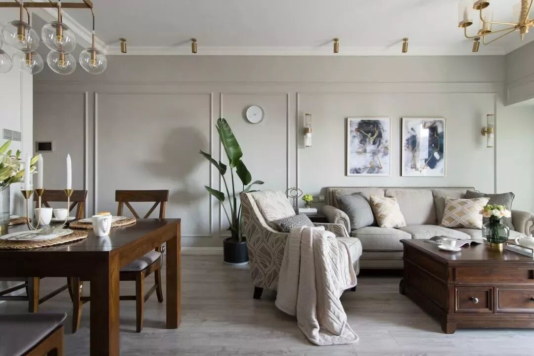 餐厅和客厅之间是没有做隔断的,墙面都是简单的做上石膏线边框,沙发背景墙上方有着挂画和壁灯作为点缀。