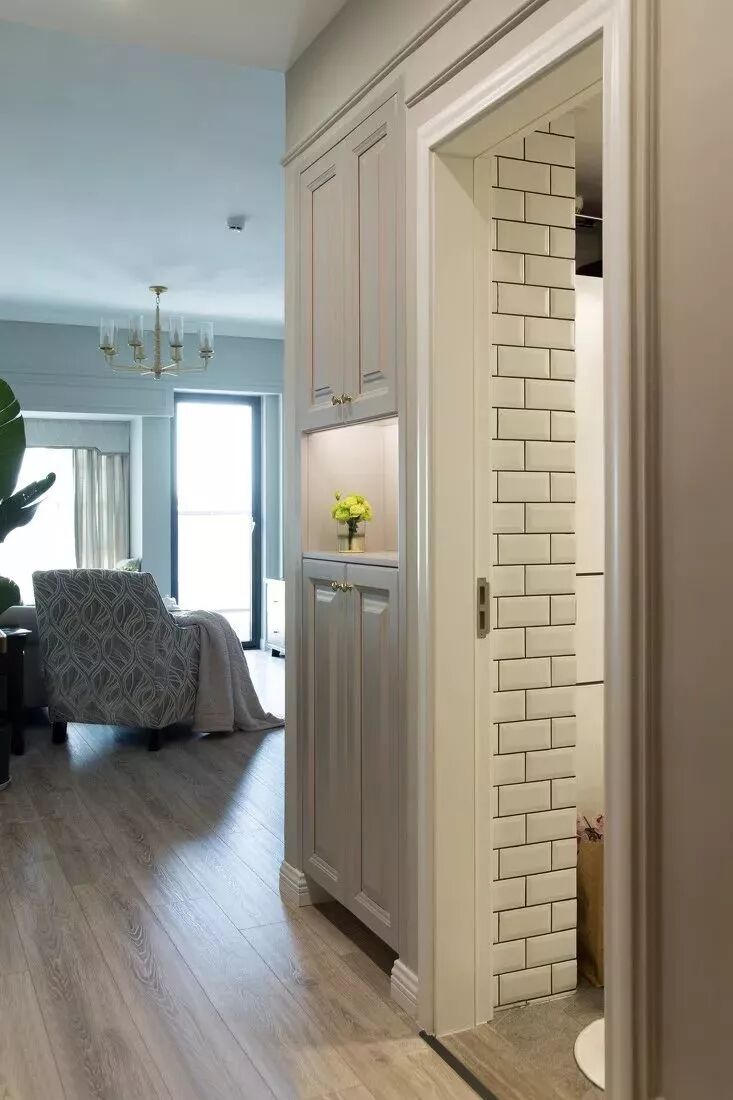 入户玄关走廊通往了厨房和客餐厅,厨房的门洞让玄关少了一些做柜子的空间。迷你鞋柜的底部和中间留空,这样使用起来更方便。