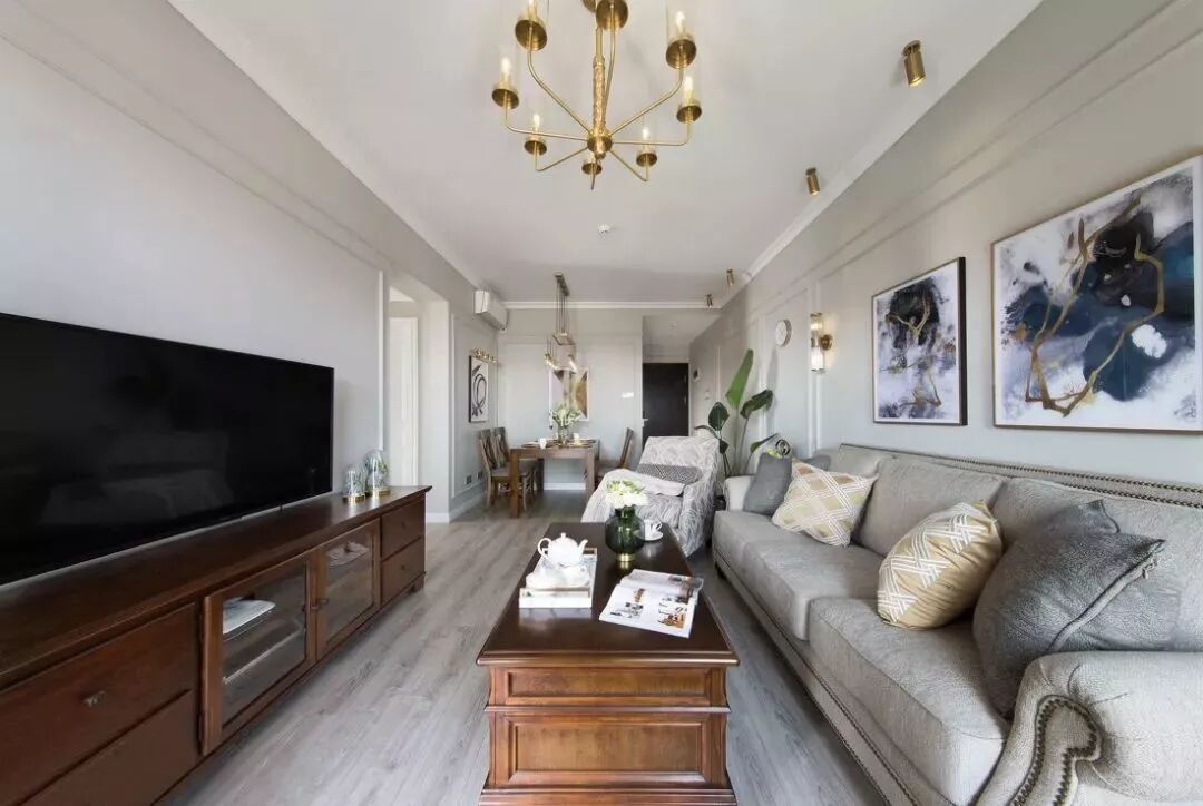 客厅的电视背景墙也是简单的石膏线边框装饰,整个客餐厅的灯具都加入了金属元素,顶部也不做吊顶,让人感觉优雅精致又简洁大方。