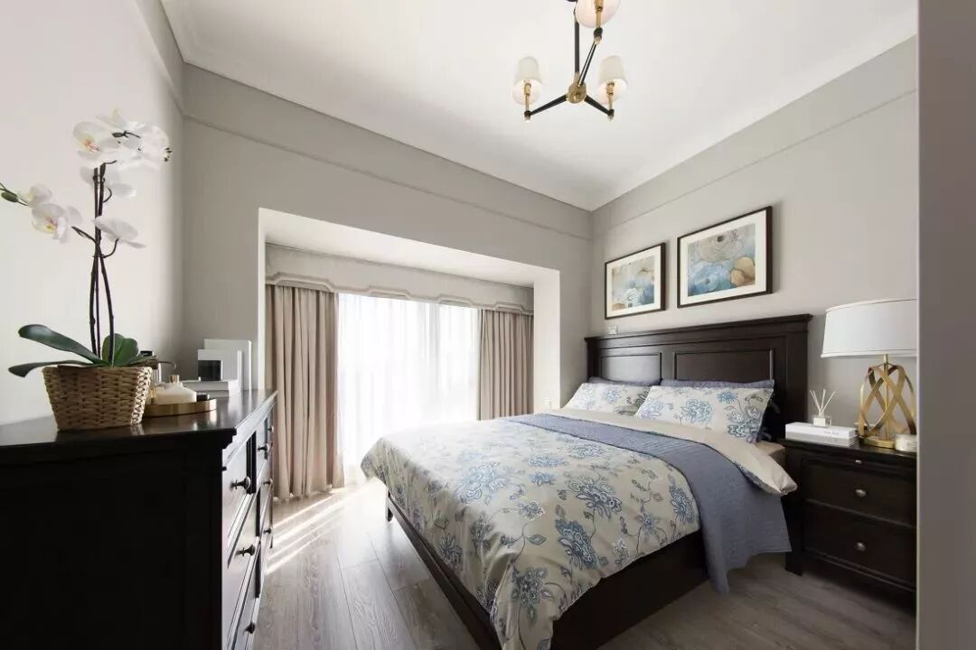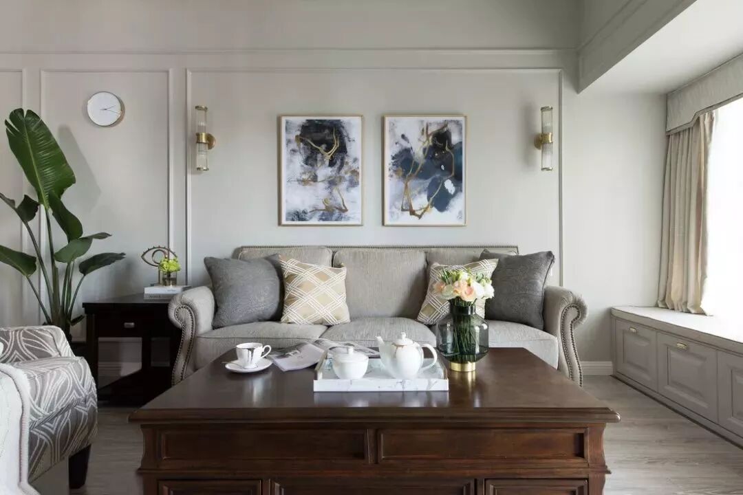 在客厅的边上还做了一排飘窗柜,既可以代替部分的沙发,又能给客厅带来更多的储物空间,现代美式风的家具看起来会更为硬朗。