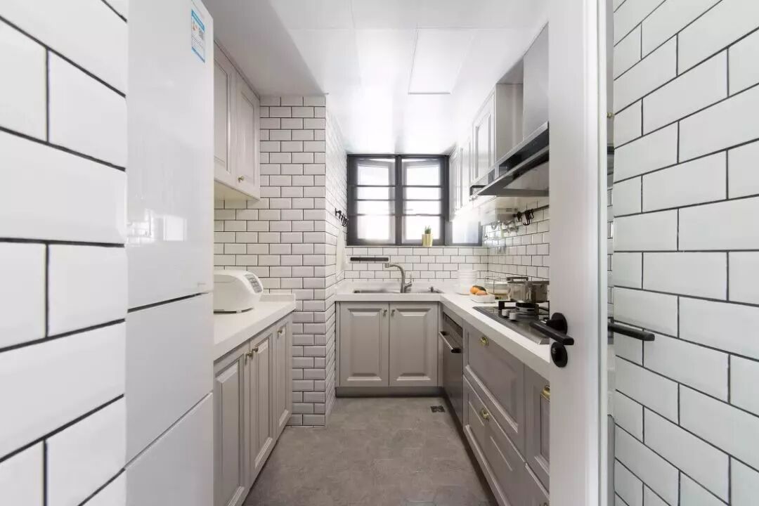 厨房内部是一个狭长的形状,橱柜做了L形加一字形的设计,工字铺贴的小白砖和灰色调的橱柜、水泥质感的地面结合,看起来非常美观。
