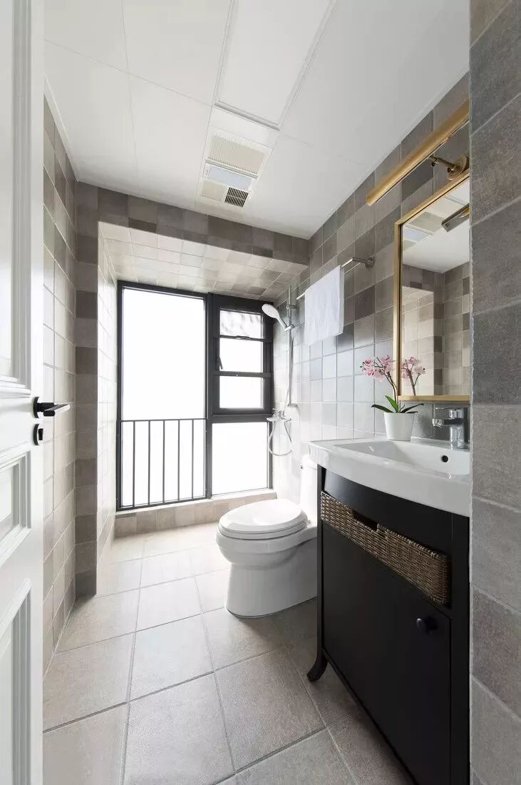 卫生间内部没有做干湿分离,墙面差异色的仿古砖看起来非常独特。淋浴区放在靠窗的位置,这样水汽也更好散发出去。