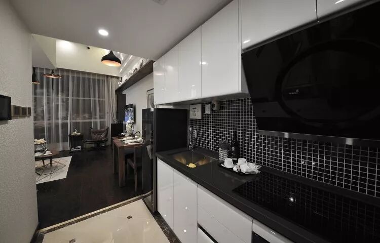 ▲开放式厨房对于小空间来说真很的很适合,满足烹饪需求。黑与白的搭配,整理利落美观。