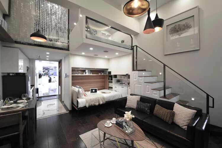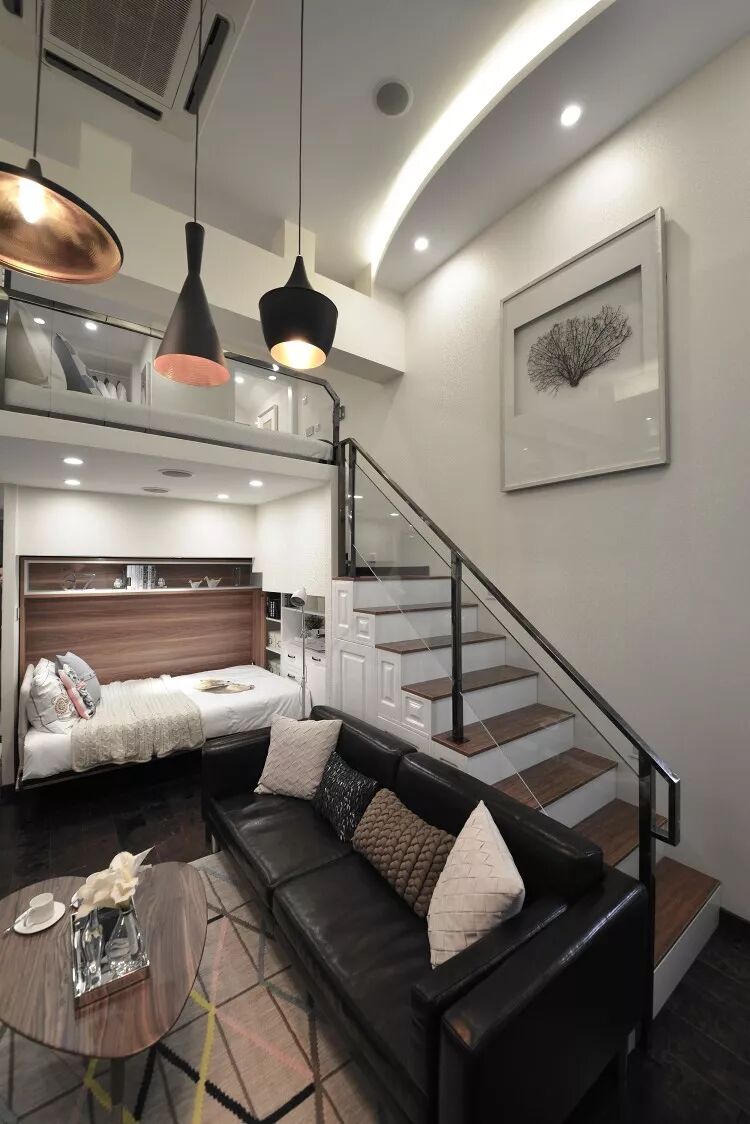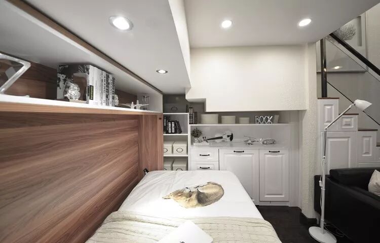 ▲一层定制了多功能壁床,可以折叠收纳,偶尔来客人可以临时居住,设计很周到。