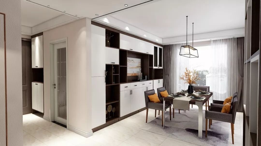 现在很多户型比较紧凑,鞋柜,餐边柜,酒柜等连在一起设计,大气简洁,收纳翻倍。