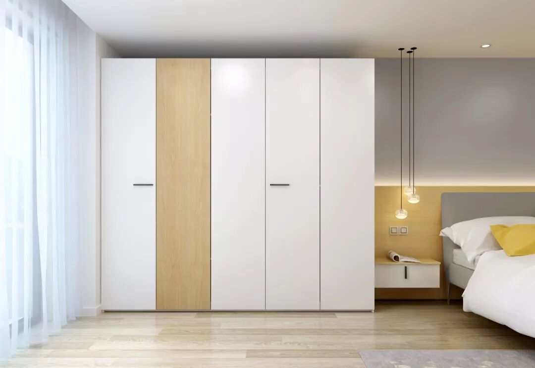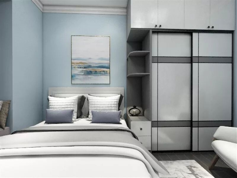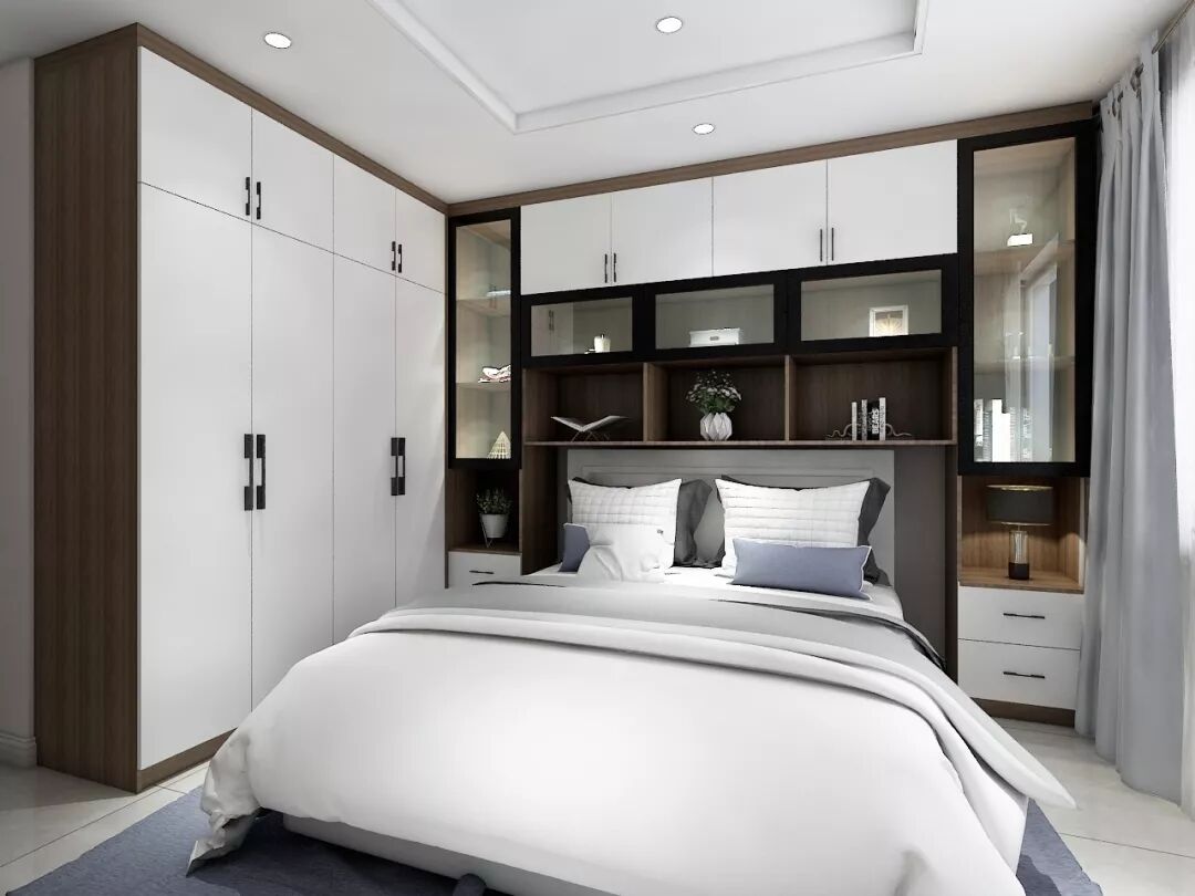 如果觉得床头上方太压抑,可以只在侧面做柜子,将床头柜内嵌进衣柜中,不占用额外过道空间,视觉上也更有整体感。