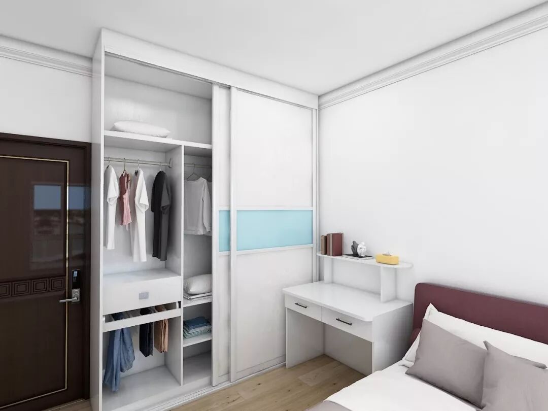 护肤品成吨的护肤达人,可以选择床头梳妆台与一柜一体式组合设计,让衣柜也一柜多用。