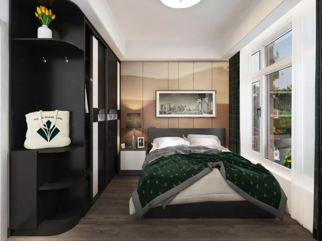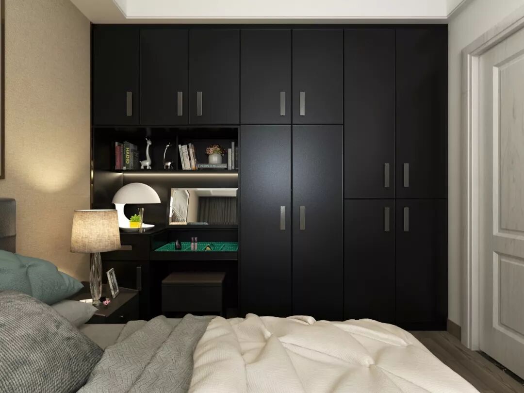 次卧简洁的空间搭配高级灰到顶衣柜,白色点缀,如午后的阳光流淌其中。