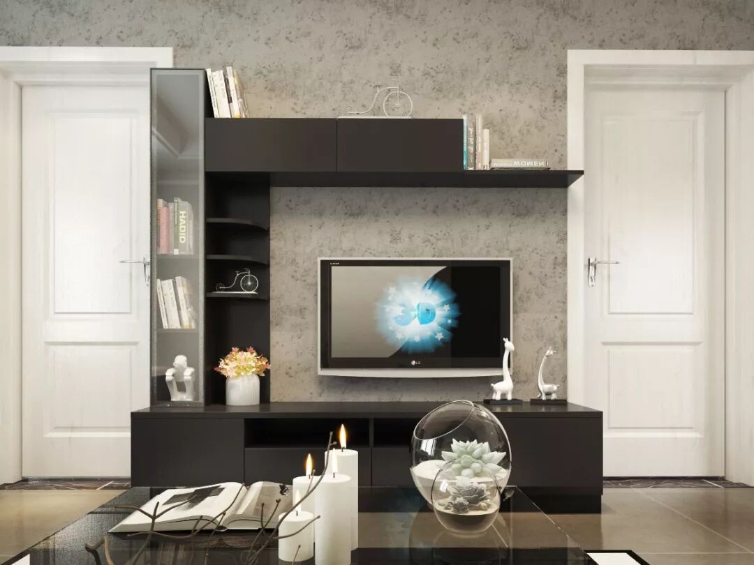 收纳电视柜简约而不简单,既有可视化玻璃柜收纳,又有吊柜搁板露天展示,