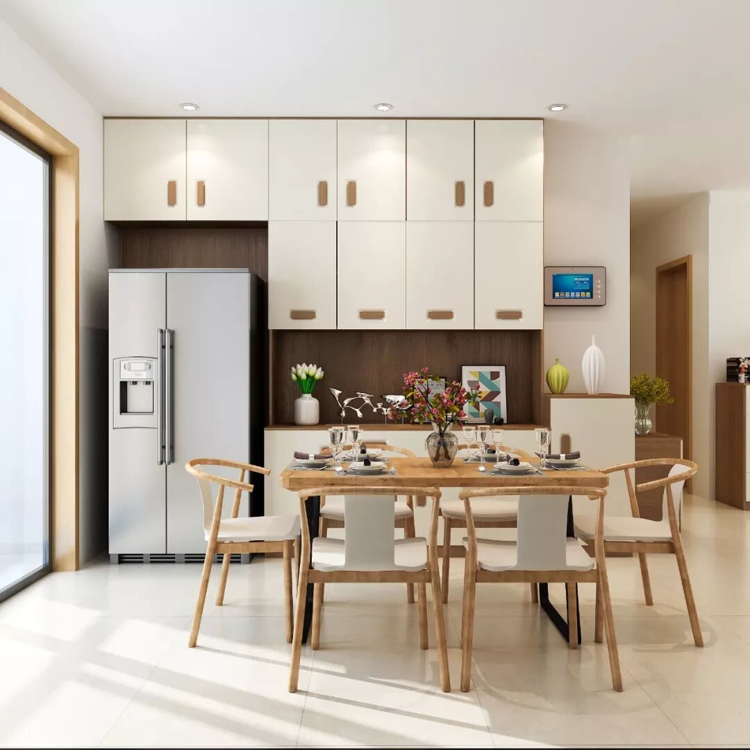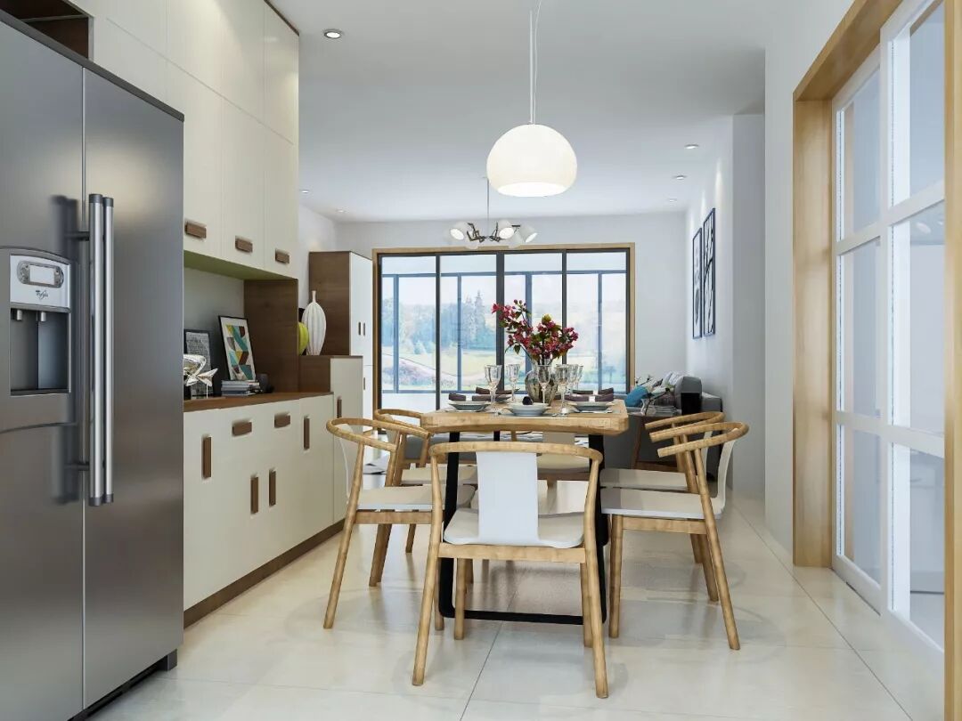 双门冰箱妥妥的嵌入在柜子内,颜值没得说,开餐拿饮料更加方便。