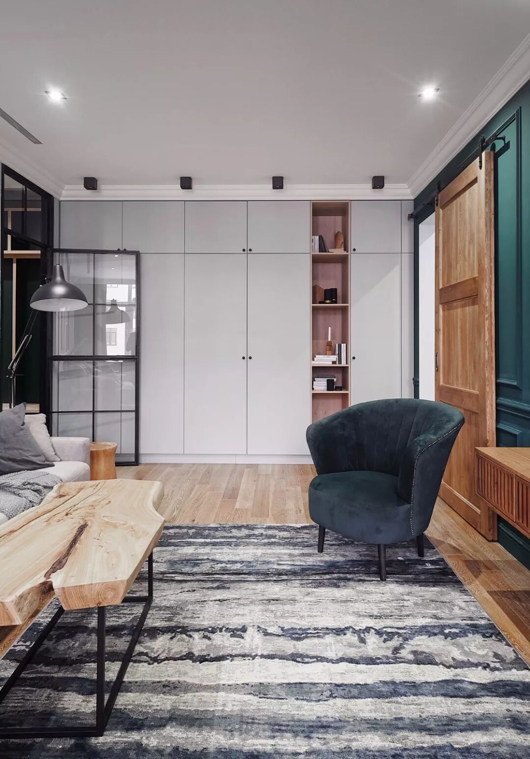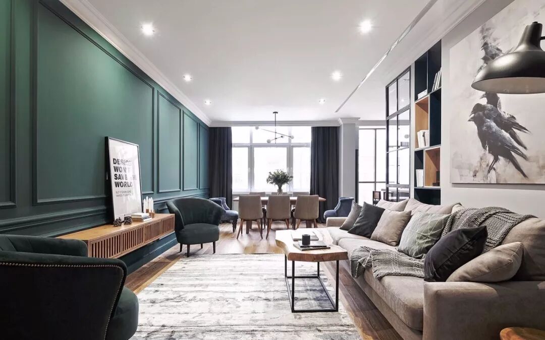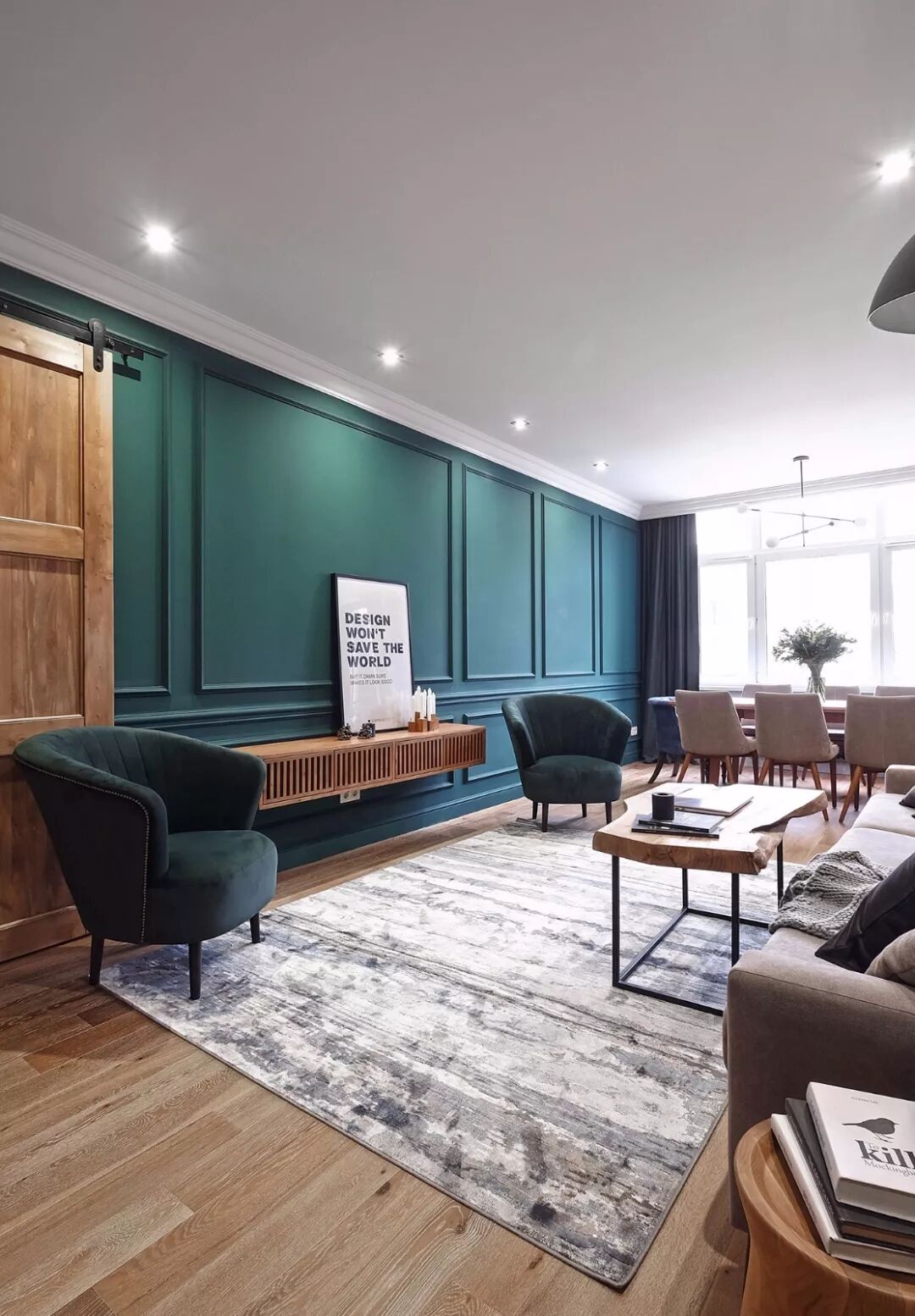 客厅电视墙大面积的涂成墨绿色,搭配浅灰色或是白色系,看起来显得干净有格调。再搭配一些木质的家具来装点整个空间,看上去有种大自然的舒适感。