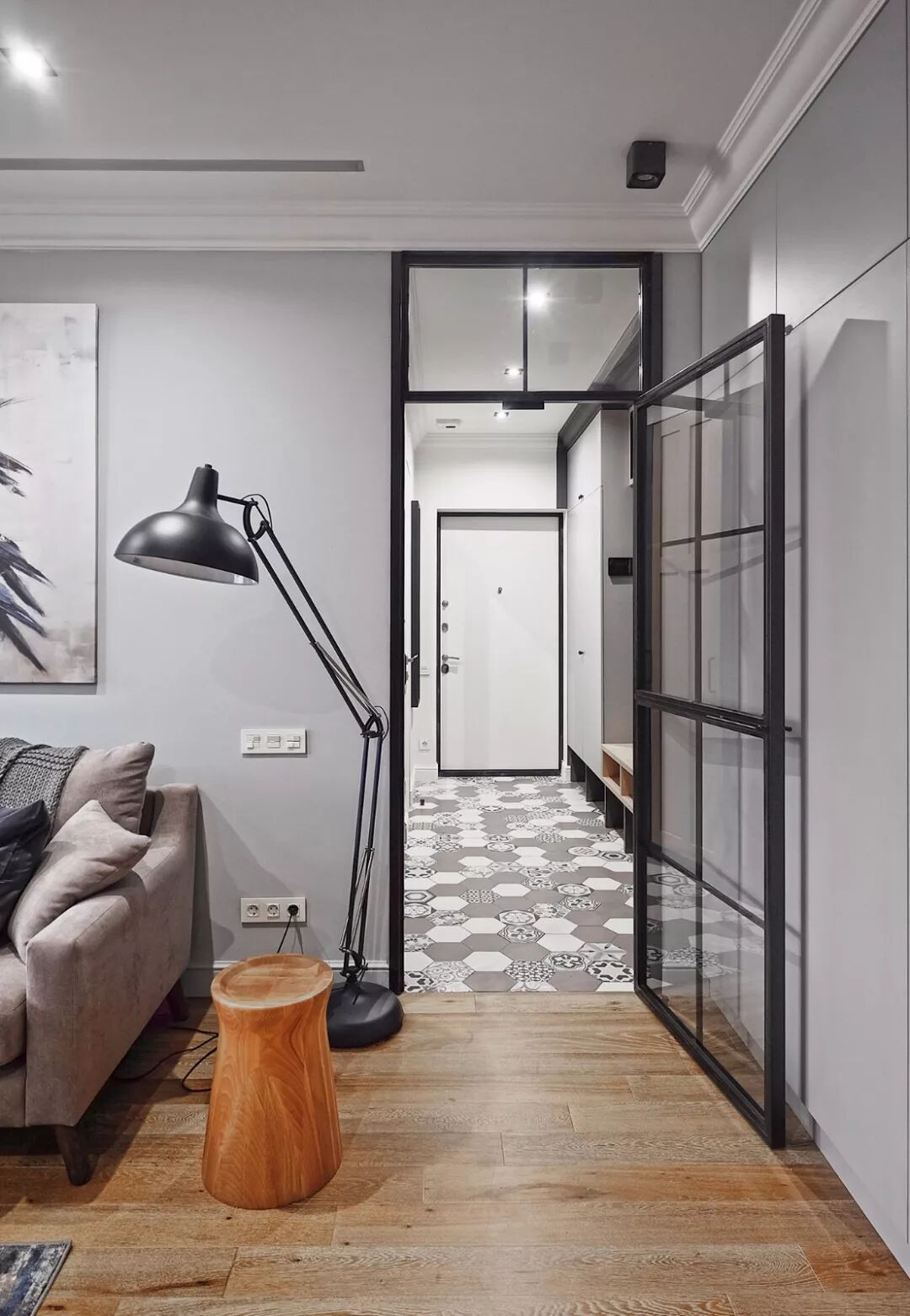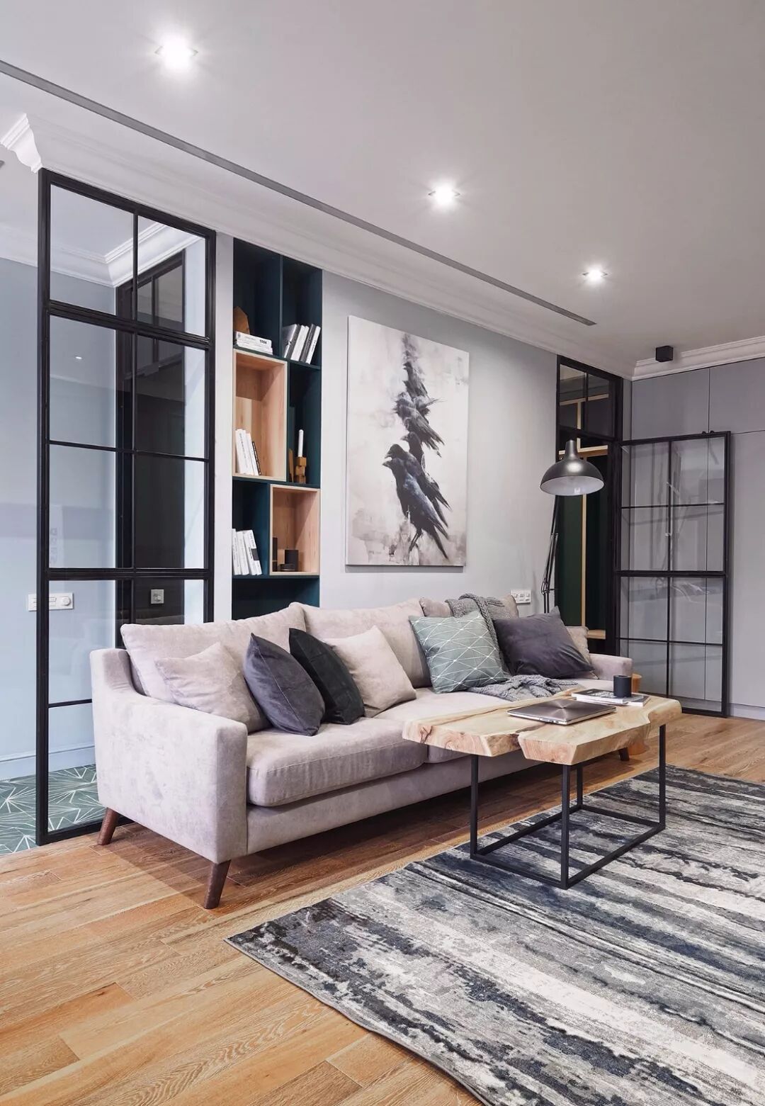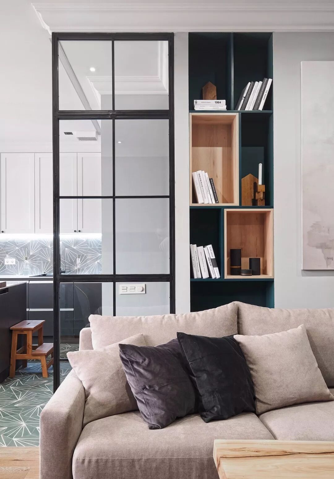 沙发背景墙利用玻璃隔断进行了拓宽,足够三人沙发的位置,还利用墙面空间做也壁柜,放些书籍,非常实用!