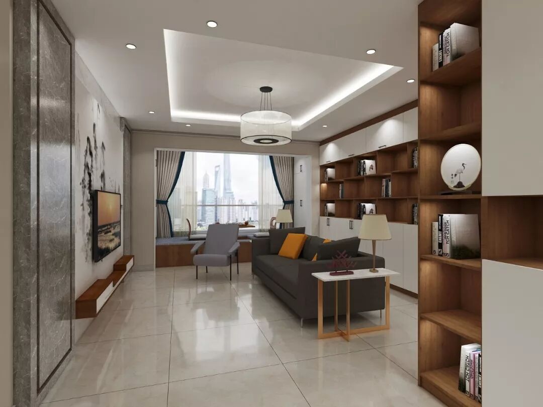 沙发背面墙设计了L型储物柜,大面积的开放展示空间,