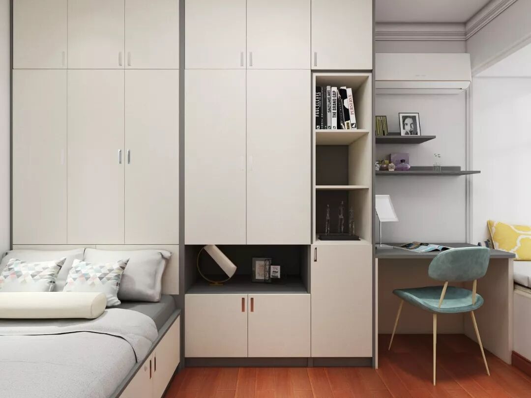 床尾设计了到顶大衣柜,平时衣物、换季被子等都能分类储放,孩子房间更整洁。
