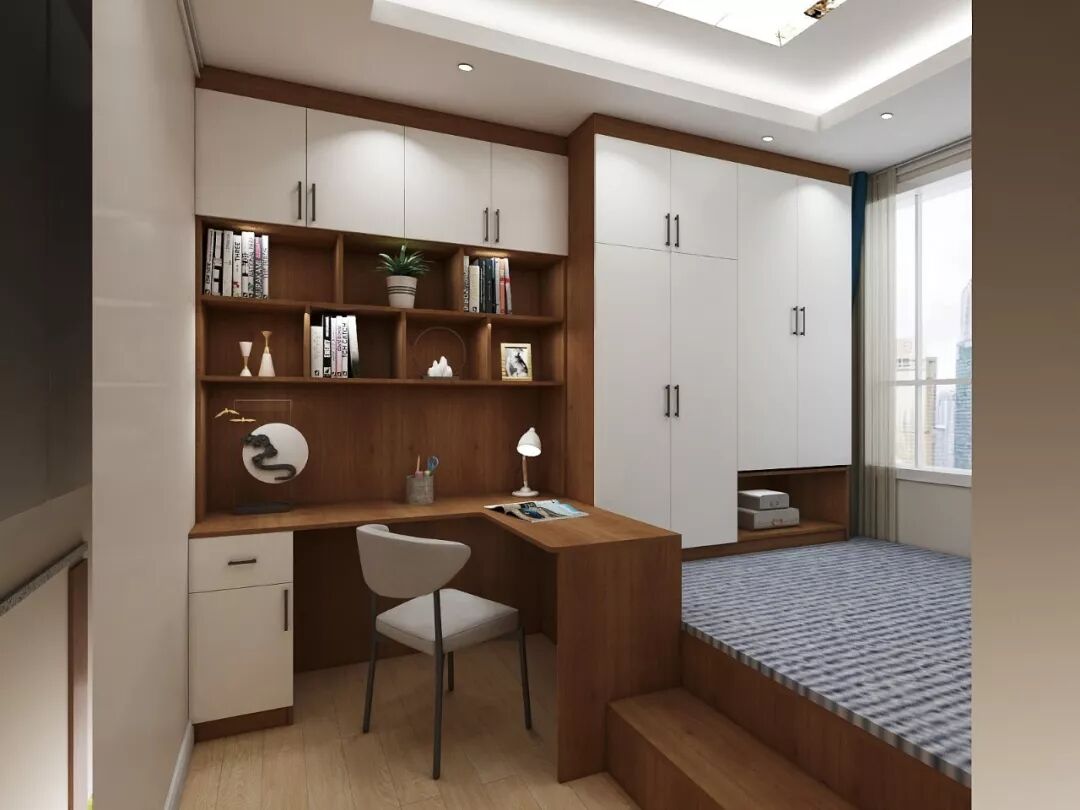 儿子的房间选择了榻榻米+到顶衣柜+书桌吊柜+圆弧形飘窗柜设计,